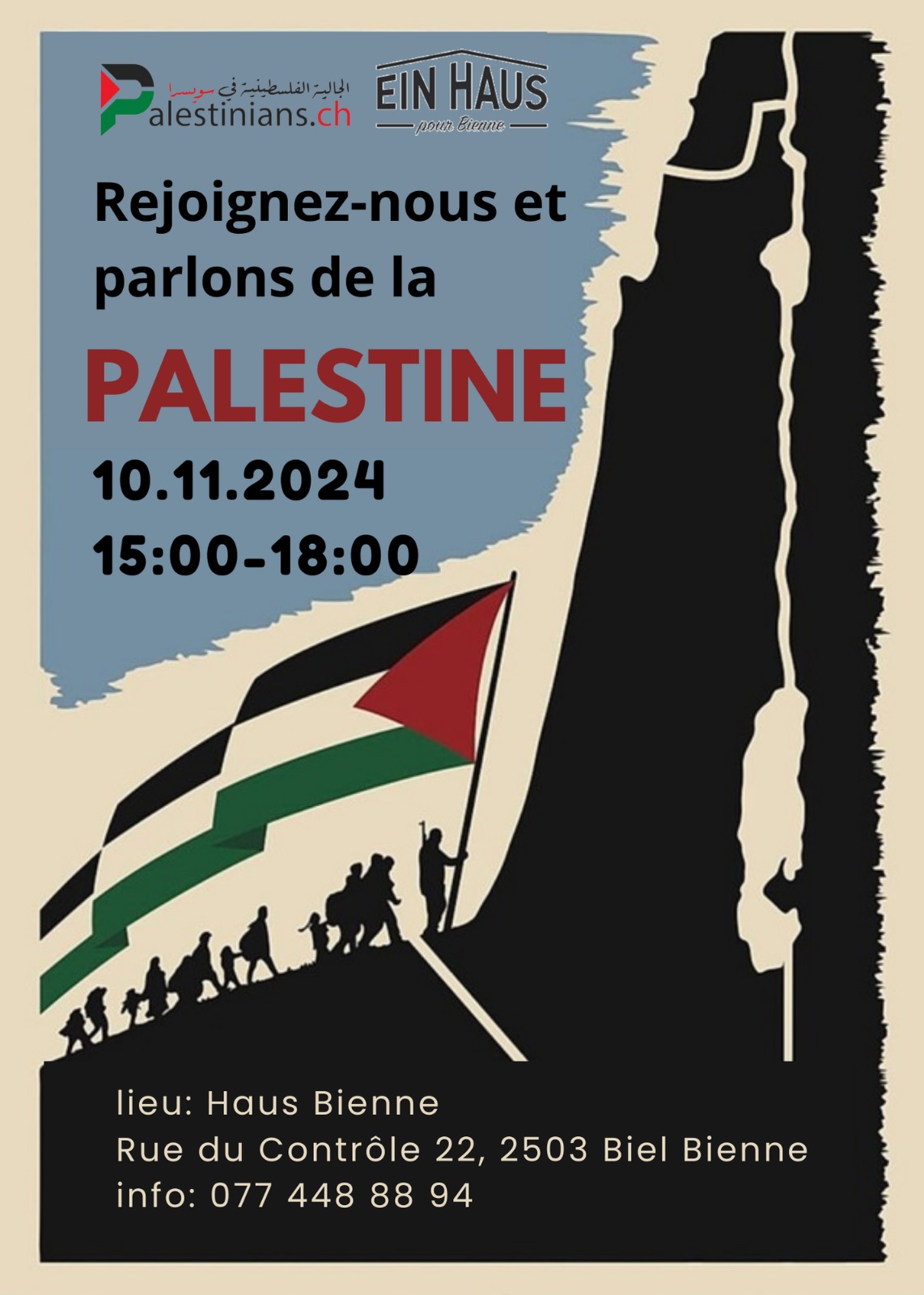 L’Association de la communauté palestinienne en Suisse a le plaisir de vous inviter à la prochaine rencontre palestinienne. L'événement aura lieu le dimanche 10 novembre 2024, de 15h00 à 18h00 à l'adresse suivante :